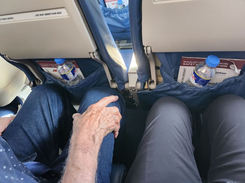 As we board our plane and are seated, I am grateful for the leg room on the the long flight over here.